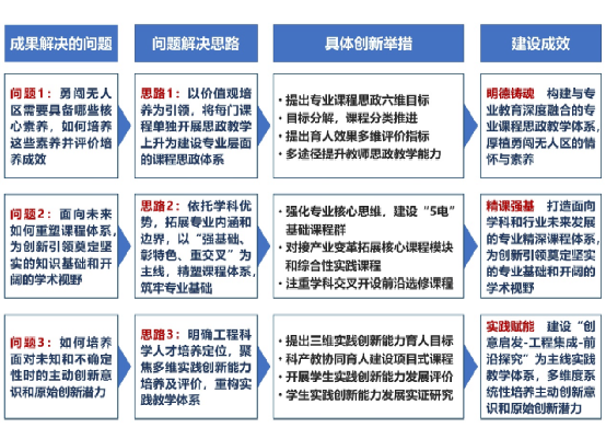 成果面向国家重大需求,确立了“面向未来”的人才培养理念,探索出“明德铸魂-精课强基-实践赋能”的传统工科专业改造升级路径:明德铸魂,凝练创新引领者的核心素养作为专业课程思政教育目标,构建了与专业教育深度融合的专业课程思政教学体系,厚植家国情怀;精课强基,面向未来对创新人才所需知识内涵和边界再设计,精塑专业课程体系,为创新引领奠定坚实的专业基础和开阔的学术视野;实践赋能,以探究性实践激发学生提出问题和挑战未知的学术志趣,构建一体化递进式实践教学体系,多维度系统性培养主动创新意识、集成创新能力和原始创新潜能。通过上述举措,充分发挥学科底蕴深厚优势,创新科产教协同机制,实现优质科研资源向创新人才知识体系和培养体系的有效迁移。