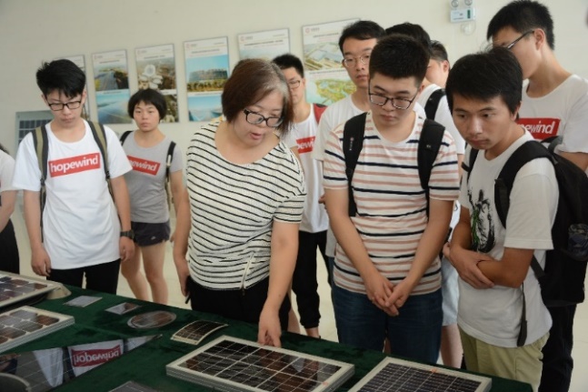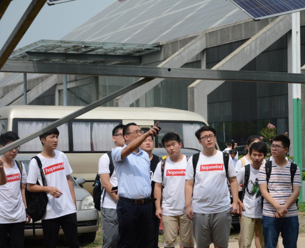 新能源认知阶段,在作完文献综述后,同学们来到位于湖北省光伏研究工业园的中心——武汉日新科技股份有限公司进行参观活动。企业工程师详细介绍了各类光伏产品、设备以及系统解决方案,从光伏板组件、到太阳能车棚、太阳能充电桩、追日型光伏架棚、风光互补路灯,建筑一体化太阳能发电系统,基于云平台的大型光伏监控系统等等,都让同学们大开眼界,热切渴望投入到新能源产品研发中。