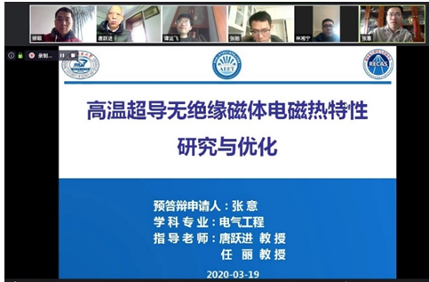 上午9点30分,电工电磁系博士张意同学成为体育网足球即时比分 首个采用在线视频进行论文预答辩的博士生,他的论文题目《高温超导无绝缘磁体电磁热特性研究与优化》,导师为唐跃进教授和任丽教授。答辩开始前,答辩委员和学生提前进入视频会议室,调试设备准备就绪。答辩主席对本次视频答辩的流程和要求做了简要介绍,随后宣布答辩会议正式开始。张意同学进行了40分钟的PPT陈述,并宣读了《学位论文独创性声明》,随后答辩委员和其他参会者对张意进行了提问。接下来张驰同学也按同样的步骤进行了博士学位论文内容陈述并接受了与会者的提问。