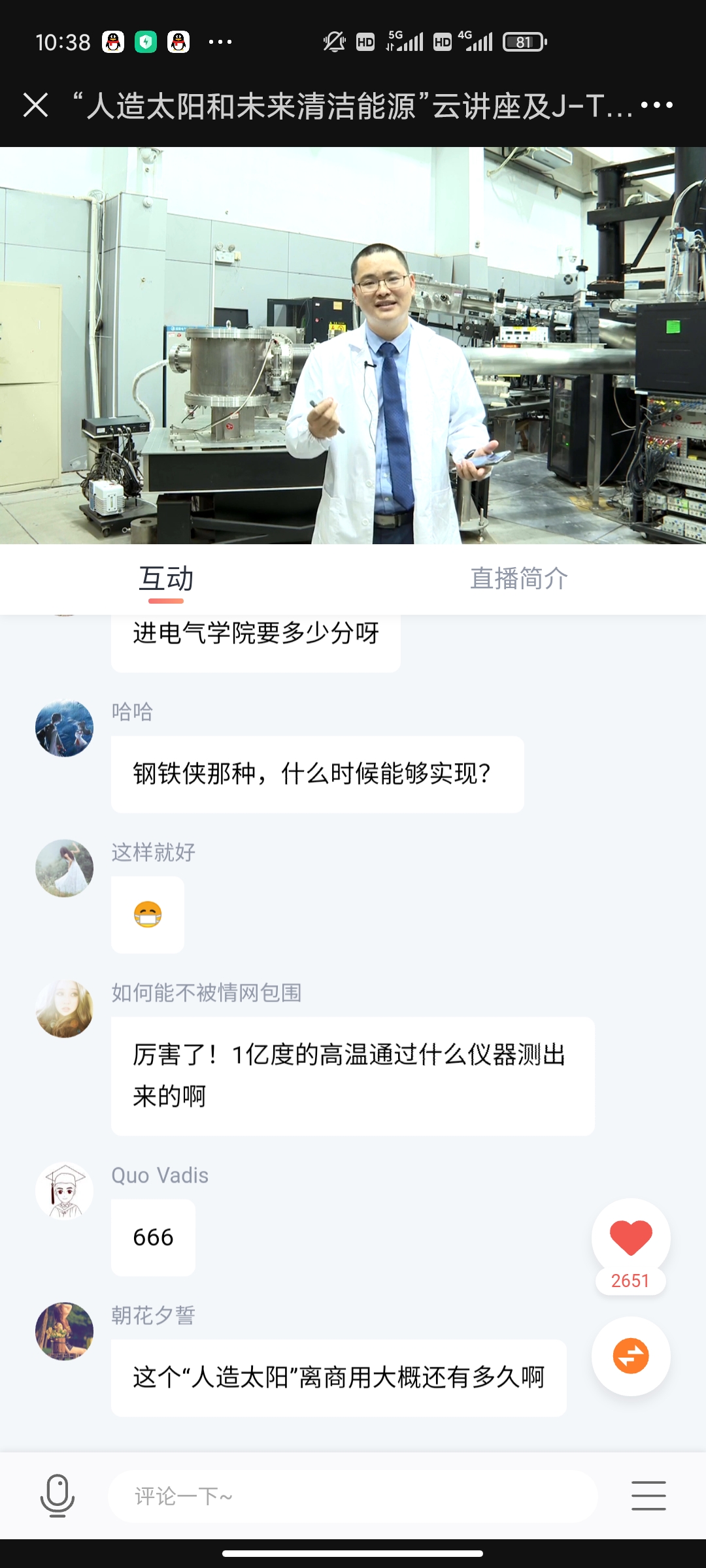 陈教授先介绍了核聚变的发展历程和聚变能前景,展现了核聚变这种清洁能源的优势,随后讲解了磁约束核聚变以及托卡马克的原理和国内外发展现状。接着,陈教授又介绍了聚变所所在的足球比分直播 以及学院的学生培养模式等,通过在线互动为众多观众解答了相关的核聚变发展问题和足球比分直播 的发展情况。