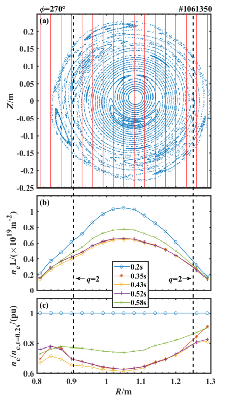 HINT2基于弛豫迭代的方法求解无磁面假设的三维平衡,已在LHD、W7-X、DIII-D上广泛应用。目前在J-TEXT上,利用HINT2首次完成了RMP作用下等离子体的三维平衡研究,并分别与偏振仪(图1)、ECE(图2)诊断对照,证明了HINT2的准确性。