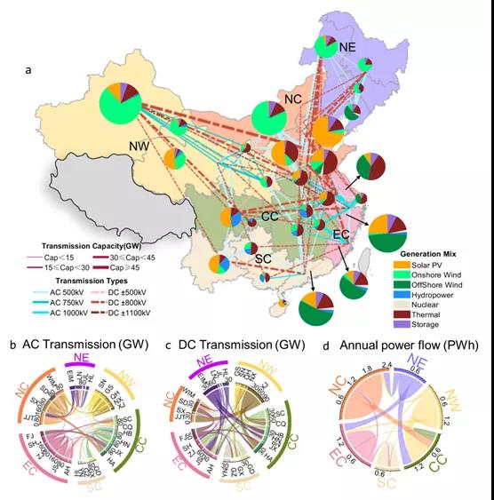 该文章给出了2050年时80%可再生能源渗透率下各省的发电装机结构和全国跨省输电线格局,如图3所示。总体来看,2050年实现80%可再生能源渗透率需要海上风电约900吉瓦,陆上风电约1700吉瓦,光伏发电约1350吉瓦。分地区来看,东部沿海地区将会装设大量的海上风电;三北地区(东北、西北、华北)仍将是陆上风电的主要建设区域,总共将建设1500吉瓦的陆上风电;而光伏发电则主要集中于西北(200吉瓦)、华北(500吉瓦)和华东区域(250吉瓦)。2050年时在高比例可再生能源情况下,全国输电线格局将发生结构性变化。由于华中地区缺乏优质风光资源,因此整体输电格局将由目前的“西电东送”转变为“四周向中部地区送电”的格局。