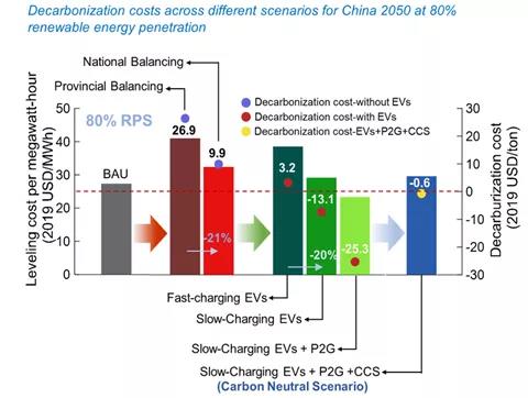 图2 2050年80%可再生能源渗透率情景各去碳策略的度电成本和碳减排成本比较