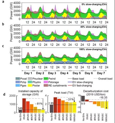 除此之外,该研究优化了碳中和情景下大量电动汽车并网充电策略并分析了充电行为对电网运行的影响,对电力系统和交通系统共同脱碳具有重要的指导意义。该研究优化了电动汽车充电策略,采用慢充充电策略可以有效利用正午的光伏发电以减小弃电率,减小电动汽车充电的尖峰负荷,如图4所示。在慢充策略的情况下,电动汽车的充电行为与目前相比出现了时间和空间上的转移,充电模式将由低比例可再生能源渗透率时的晚高峰、住宅处充电转移到下午时刻、目的地(工作地点或者商场等)进行充电,该结果对电动汽车充电设施规划和充电价格的政策设计具有重要指导作用。