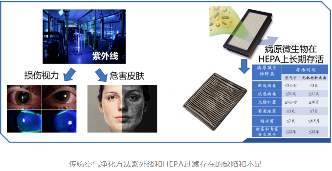病原微生物气溶胶是多种传染病的传播途径之一,目前常用的病原微生物气溶胶消杀方法包括紫外线(UV)杀菌灯和高效空气过滤器(HEPA)(下图所示)。