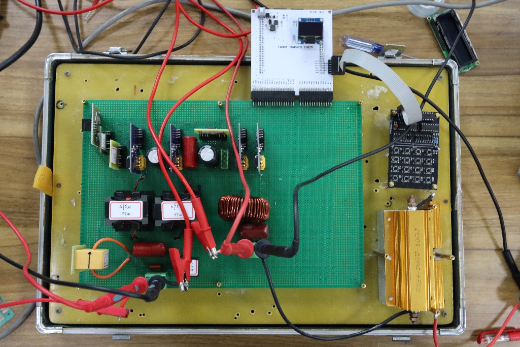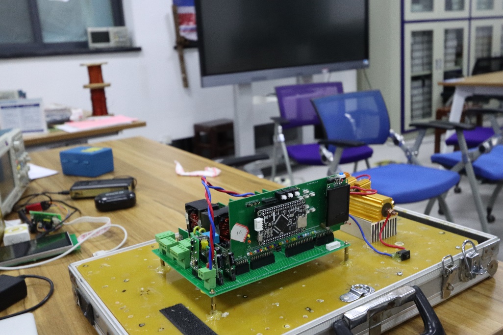 由钟远浩、吕清扬、宁艳钊组成的P02组作为基地“老牌”队伍,他们在一年的培训里从最基础的模块以及代码开始,逐步实现一个简单的BUCK电路,到暑期培训中完成在线式不间断电源以及单相整流器,最后省赛上制作单相交流电子负载。一路走来从无到有的经验,他们在第二天便完成了电路的制作。最开始作品的损耗3.5W,经过电感重新绕制,更改PI参数等一系列方法,成功将系统的损耗降低到2W,最终成功完成比赛测评获得湖北省特等奖。