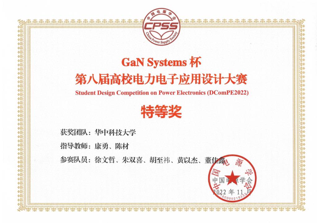 2022年11月17日,中国电源学会刊发消息,“GaN Systems杯”第八届高校电力电子应用设计大赛圆满结束,同时颁布了大赛参赛队获奖名单。华中科技大学代表队在众多参赛队伍中脱颖而出,凭借创新的设计方案与优异的实测数据,从参加决赛的16支高水平队伍中披荆斩棘、脱颖而出,斩获本次比赛所颁发的唯一最高奖项:特等奖!