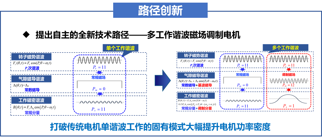2017年以来,华中科技大学足球比分直播 曲荣海教授团队针对电机功率密度上限问题进行理论探索,从电磁理论创新出发,建立“多工作谐波磁场调制电机系统”这一自主的全新路线,如图1所示,打破传统电机单谐波工作的固有模式,实现了航空发动机伺服电机系统关键技术的突破(图2):