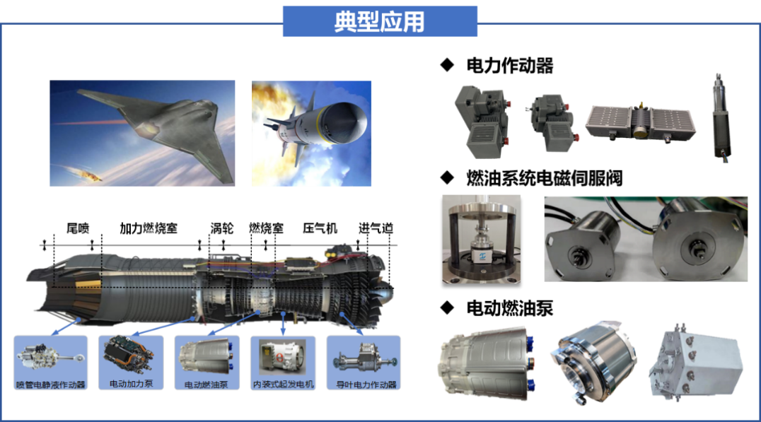 基于上述关键技术突破,如图2所示,团队自2022年1月以来研发了系列高功率密度航空发动机电机系统产品,应用于国际首台磁性回中式电液伺服阀,将寿命从“次数”提升至“年数”,关键指标超过国外的同类产品,国际上首次实现无接触回中,大幅降低加工制造难度与维护成本,阀门使用寿命实现数量级提升,具有很好的工程应用价值,对于国产航空发动机核心零部件自主知识产权具有重要意义。研发我国首套电动燃油泵电机并装备于高超音速装备,功率密度是当前已公开资料中功率密度最高的电动燃油泵电机系统,超过国外品牌同类系列产品。2022年以来,研发了多型电机/控制器并装配发动机中,顺利实现验证目标,标志着我国多电分布式发动机控制系统从无到有跨越式发展取得阶段性突破”。