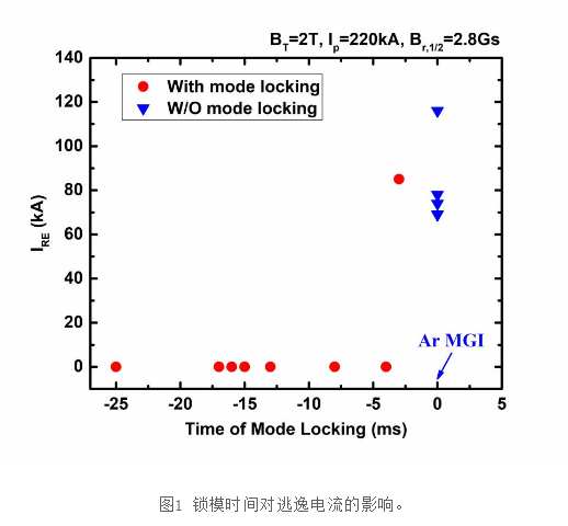 陈忠勇等人借助于J-TEXT托卡马克先进的扰动场研究了共振磁扰动(m/n=2/1)对破裂期间逃逸电子的抑制。该实验利用大量氩气注入使得拥有预存磁岛的等离子发生破裂,形成稳定的逃逸电流平台。强度为2.8Gs的2/1模式静态共振扰动场在等离子体热淬灭之前投入,用于降低撕裂模的转动频率并实现锁模。通过改变共振扰动场的投入时间,发现当锁模发生时间比等离子体破裂时间提前4ms时,破裂期间的逃逸电子能被完全抑制,如图1所示。其可能原因是大磁岛在破裂期间形成的强烈磁扰动破坏了等离子体中的完整磁面,从而加速逃逸电子的径向输运,促使了逃逸电流的完全抑制。NIMROD模拟也证明了在预存大磁岛条件下,破裂期间产生大规模的随机化使得逃逸电子迅速的损失,抑制了逃逸电流的形成。该论文针对共振扰动场对逃逸电子抑制的影响提出了锁模时间及磁岛宽度对逃逸电流的影响,受到了国内外同行的广泛关注。这篇论文为共振磁扰动对等离子体破裂下逃逸电子的产生和抑制提供了新的思路,对下一代装置上逃逸电子的抑制和控制具有重要参考意义。