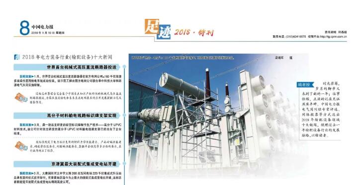《中国电力报》于2019年1月10日,刊出2018年 电力装备行业(输配设备)十大新闻。体育网足球即时比分 研制的项目入选头条新闻。