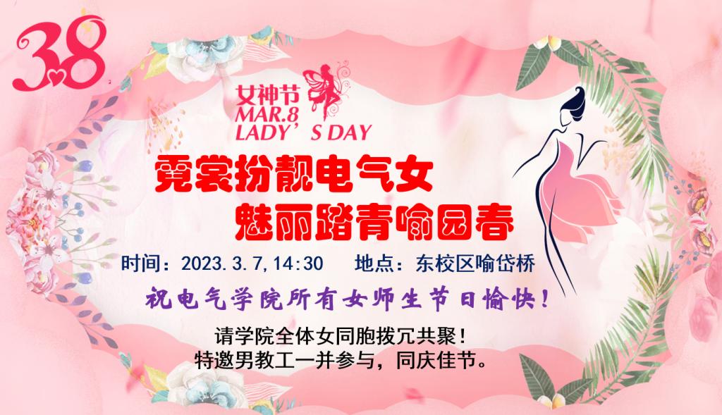 为深入学习贯彻党的二十大精神,激发广大女教职工立足岗位、提升建功的热情,展示体育网足球即时比分 女教职工的良好精神风貌,团结动员全体女教职工听党话、跟党走,参加校工会组织的“凝聚她力量·奋进新征程”系列活动,学院工会拟于3月7日(星期二)下午,举行“霓裳扮靓电气女 魅丽踏青喻园春”活动,现将有关事项通知如下: