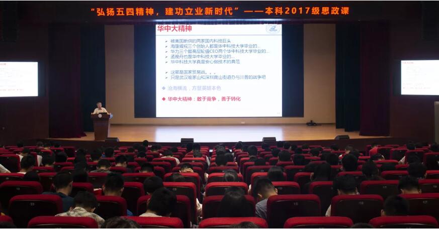5月23日,院长文劲宇以形势与政策课的形式,为2017级全体学生上了一堂十分生动的思政课。文劲宇讲解了伟大五四精神的意义和学院使命,对华中大精神“敢于竞争,善于转化”进行了细致讲解。文劲宇为同学们介绍了许多新时代电气前沿科技,结合中美贸易等复杂的国际形势,激励同学们要敢于面对困难,抓住重要机遇,以责任心做人,以上进心做事,以事业心规划人生,努力成为电气领军人才。