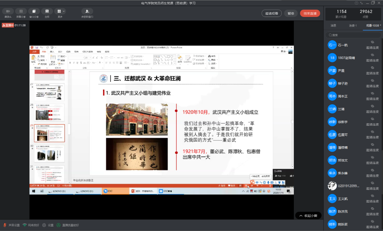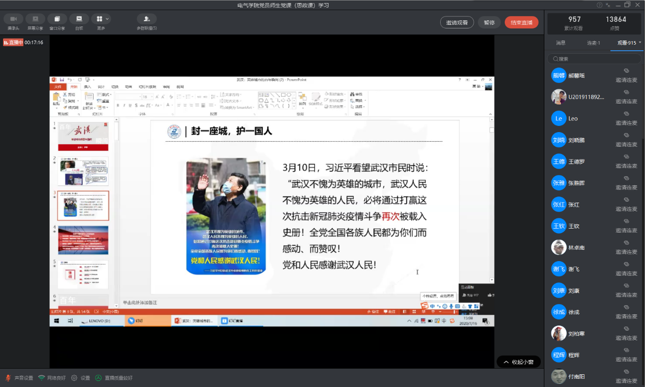 7月16日下午,足球比分直播 邀请华中科技大学马克思学院教师尹平,以“武汉,一座英雄城市的百年瞬间”为主题,在线上为学院的党员师生上了一场精彩的党课和思政课,共有1200名余名师生参与了学习。
