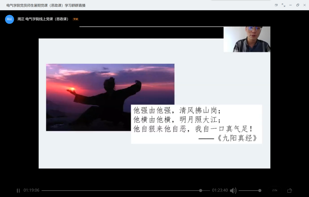 最后,闫帅老师借用《九阳真经》里的一句话,“他强由他强,清风拂山岗;他横由他横,明月照大江;他自狠来他自恶,我自一口真气足”,指出我们要坚持自力更生、艰苦创业、改革开放、深化国际合作,坚持做好自己。