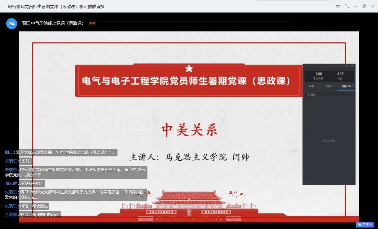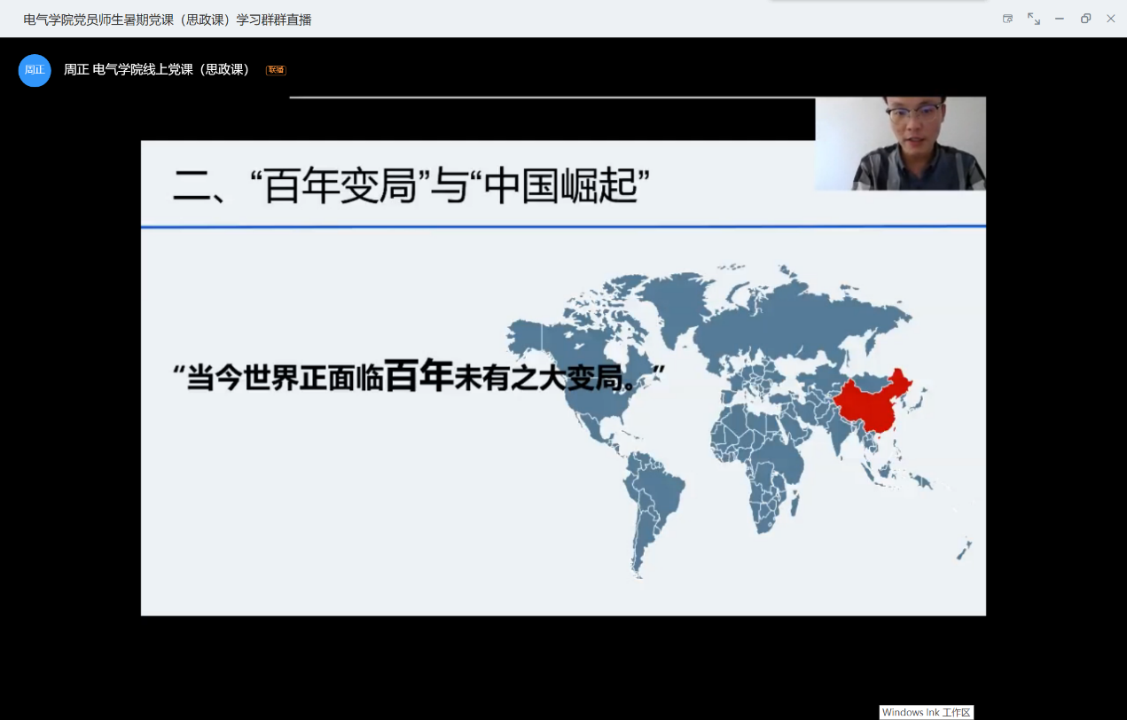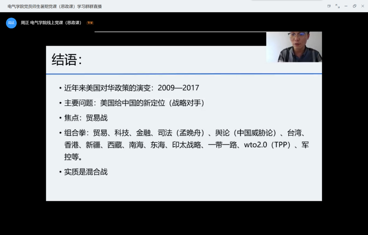 课程结束后,学院参加学习的老师和同学纷纷在授课平台上向闫帅老师表达了感谢。大家纷纷表示,听完闫老师的课之后产生了很多感触和新的观念。电气本科17级第二党支部的学生党员王艺飞表示,在新的时代,我们应该更新传统认知中的中美关系,中国的快速发展崛起已经开始威胁到美国的霸权地位,而且由于疫情,更加加剧了美国对华政策的强硬化。本科18级党支部的学生党员成昕雨表示,面对当前的局面以及未来复杂多变的国际形势,我们应当坚持思维底线,做好长时间应对外部环境的思想和工作准备。在后疫情时代,推进国内治理机制的进步与提升,缓解疫情所带来的冲击稳住民心。同时,加强国际化合作,携手共同应对挑战。