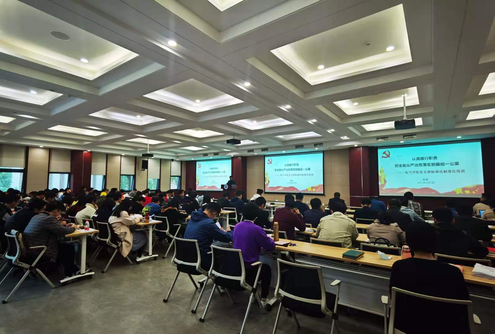 2020年11月5日下午,足球比分直播 分党校在电气大楼B203多功能厅举行了党支部标准化规范化建设培训启动大会暨集中学习辅导。本次培训以习近平新时代中国特色社会主义思想和党的十九大精神为指导,进一步推进“两学一做”学习教育常态化、制度化和党支部标准化、规范化建设,提高党支部书记和委员对党支部建设重要性的认识,帮助党支部书记和委员熟悉工作职责,掌握党支部建设的规章制度,提升对党支部工作的履职能力和实际操作能力。集中培训内容主要包括学院党支部的任务与职责等总体介绍、全国党建工作标杆院系创建工作汇报动员和党支部标准化规范化建设工作业务培训等三个内容。