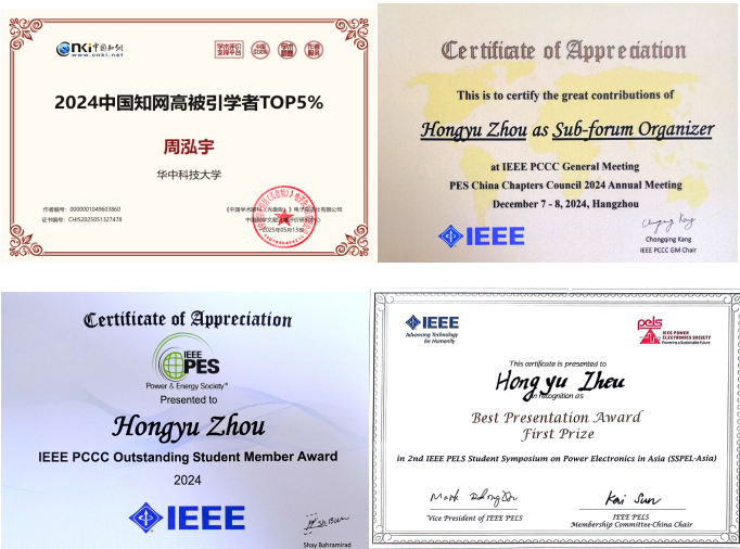 勇立创新潮头。在提升自我的同时,周泓宇还积极营造群体创新气氛,创立IEEE PES华中科技大学学生分会,组织举办全国性研究生创新论坛,多次在国际/国内学术会议做演讲报告,激发广大研究生同学创新热情。发扬传帮带与引领作用,指导本科生及低年级研究生结合国家重点项目开展研究工作。先后帮助、指导8名低年级同学完成科研项目3项,发表高水平论文6篇,授权国家发明专利4项,研究成果与国家电网公司合作应用于我国华中电网、西北电网,助力实现高比例新能源电网安全稳定运行。