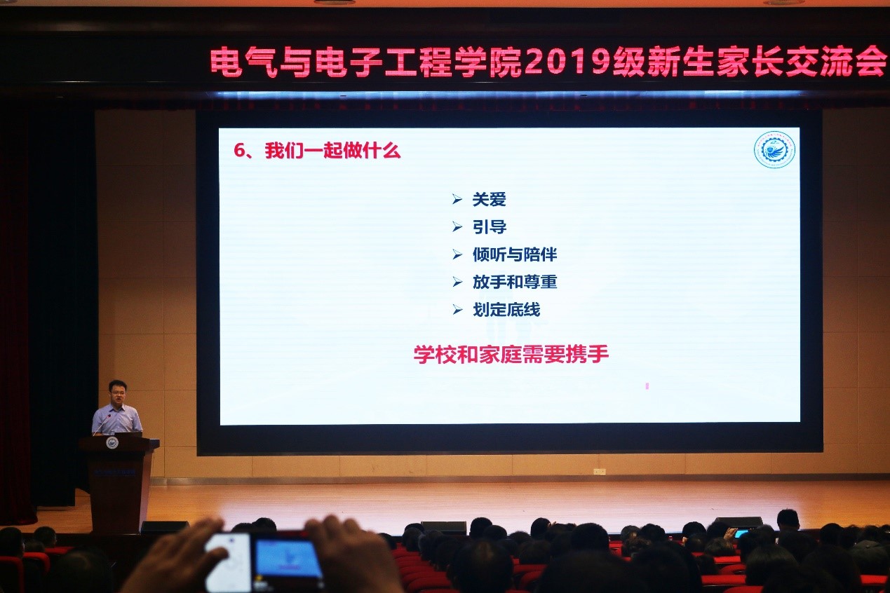 8月30日晚,在圆满完成迎新工作后,学院在电气大楼报告厅举行了本科2019级新生家长会。足球比分直播 党委书记陈晋、副院长李红斌、党委副书记罗珺、院长助理杨勇、教务科科长朱秋华、学工组组长曹攀辉以及400余名新生家长参加会议。大会由足球比分直播 本科2019级辅导员李毅主持。这是学院首次在电气大楼报告厅举行家长会,报告厅内座无虚席。