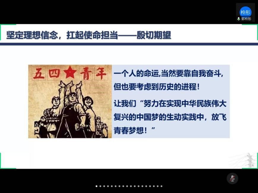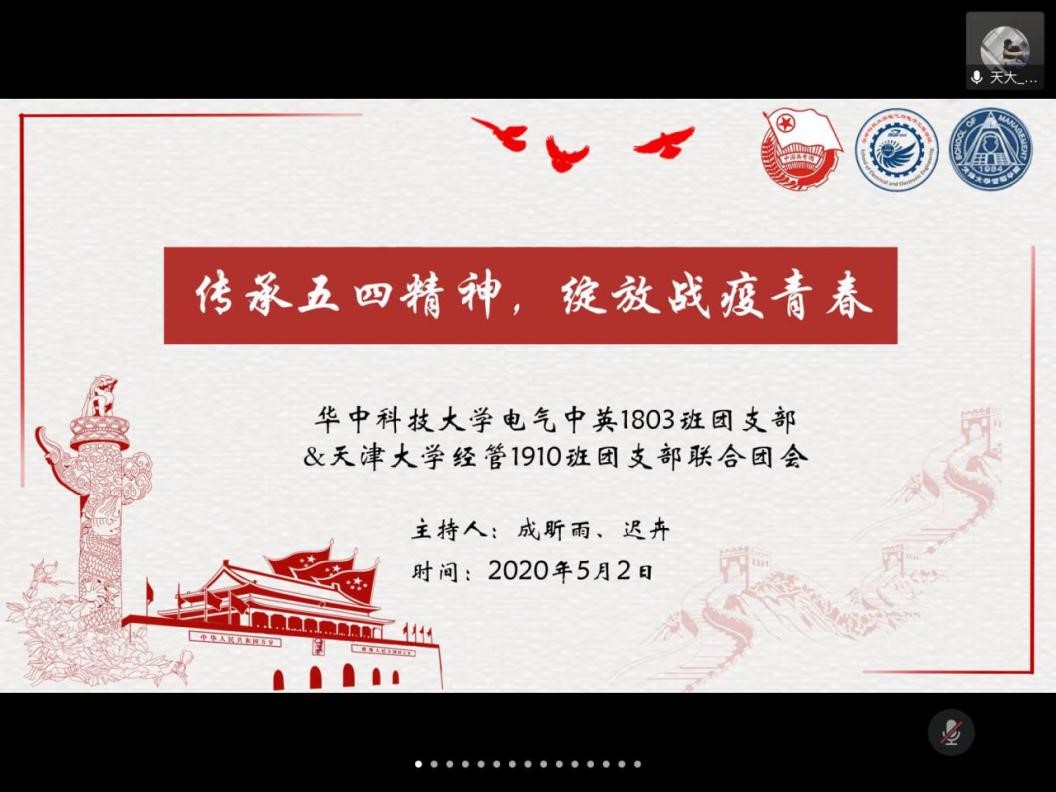 在五四青年节到来之际,为引导团员深刻理解新时代五四精神深刻内涵,传递青春战“疫”正能量,5月2日晚,足球比分直播-体育网足球即时比分中英1803班团支部联合天津大学管理与经济学部1910班团支部共同开展了以“传承五四精神,绽放战疫青春”为主题的线上联合团会。天津大学管理与经济学部2019级辅导员陈琪、华中科技大学足球比分直播 团委副书记、辅导员柳子逊参会指导。