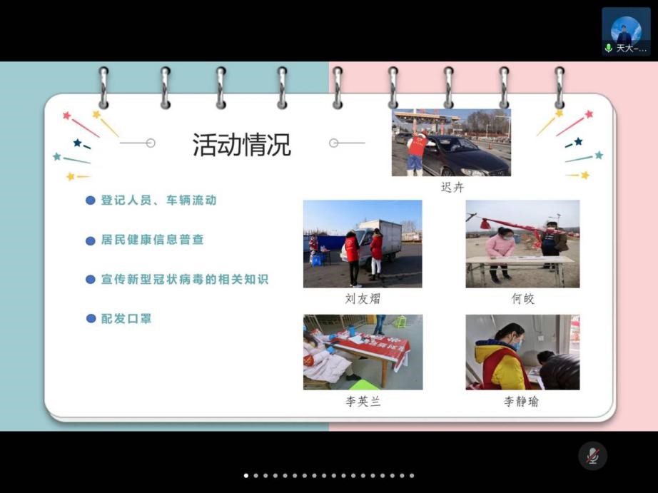 天大的李英兰同学从“社区普查”、“网络公益”、“宣传引领”和“学业帮扶”四个板块,分享了经管支部的志愿活动内容,向同学们展示了为抗疫做贡献的不同方式,鼓励两支部团员发挥自己的优势与特长,为国家和社会做出贡献。