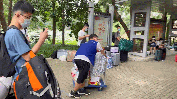 在校内车站,一辆辆黑白分明的“熊猫校园车”有序开行,将新生们送到指定地点;在迎新处,一群身着“蓝马甲”的志愿者拖着小推车,帮助新生把大包行李更快更轻松地运往校车点;在服务站点,志愿者为新生准备了大礼包,手绘地图、华科明信片、报纸图案的校史馆册等,让新生一进校园就感受到满满的关怀。