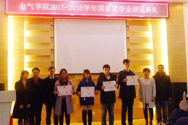 罗珺、曹攀辉、萧珺、雷浩楠和周阳为获奖学生颁奖。曾倩倩、鲁哲别、韩杰祥、程思远、卓振宇、陈永昕、熊永新、房莉、佘倩、闫林芳、陈雪梅、詹锦、向绍杰、韩应生、贺鸿杰、高子晗、潘辰、陈泓宇、李思妍、徐天启、谷鹏宇、田原文、夏天、姜壹博等24名本科生,鲁双杨、程勇、邵骏、王元超、宗天元、赖锦木、张芮、王大磊、岳远富、林艺哲、李志远、蒋亚杰、彭明洋、张立晖、邹剑桥、李立威、周昀、王栋煜、高玉婷、黄都伟、张力戈、向往、张君、贾少锋、刘海、史尤杰、肖浩、陈曦、黄玉杰、辛亚运、邓韦斯等31多名研究生获得2015-2016学年度国家奖学金。伴随着热烈的掌声,获奖学生有序上场,并与颁奖老师合影留念。