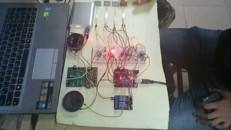 本设计实现的电子鼓,能通过使用者敲击4 块鼓垫,每块鼓垫使喇叭发出不同频率的声音;并根据频率的不同,能使LED 灯产生不同不同的灯光;还可以通过安装的蓝牙模块实现与手机的无线通讯,实现无线播放音乐的功能;1602 显示屏可以显示执行操作的提示。