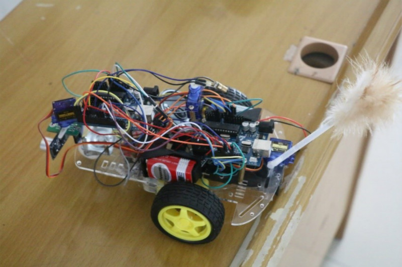 本设计实现的逗猫小车机器人,能实现在无人状态下,利用激光对猫进行挑逗,触发猫的行为,并利用小车的避障系统,完成逗猫的最终效果;在人为控制下,利用蓝牙模块对小车机器人具体地指挥行动。系统由三部分组成,分别是蓝牙传输系统、激光控制系统和避障系统,统一地进行工作。