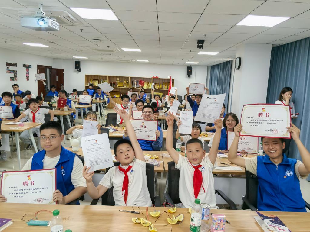 电气本科23级卓越班胡文俊带领大家走进电的世界,在一系列有趣的讲解后,少先队员们争相说出自己见过的生活用电场景,并继续了解了很多前沿的科研实例,学习科学创新背后令人振奋的科学家故事。接着,电气本科23级卓越班李俊玮通过一个有趣的水果电池实验带领大家进一步加深知识的理解,少先队员在校外辅导员的协助下动手制作水果电池,观察电池使LED灯亮起的神奇景象。实验结束后,李俊玮引导队员思考总结实验中出现的问题并解答。