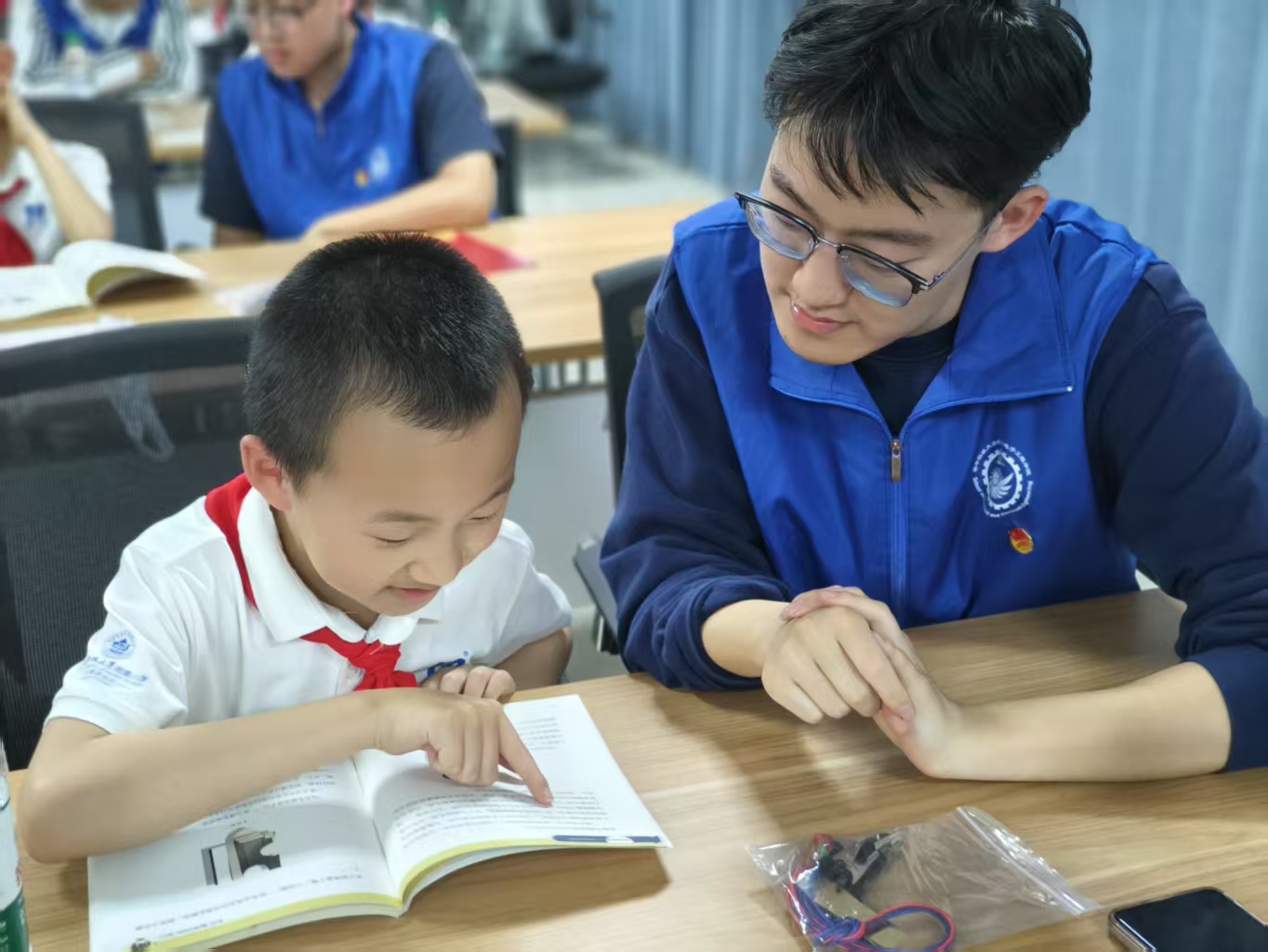电气本科23级卓越班竺奕帆为大家做足球比分直播 原创科普读物《喻小电历险记》导读,通过问题引导少先队员在书中寻找答案,校外辅导员们则为队员们进一步讲解与提示,附小的少先队员争相举手回答,也对电磁学知识产生了更加浓厚的兴趣。