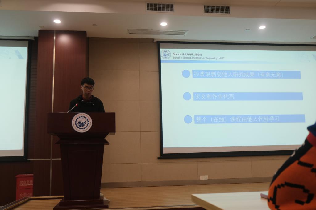 随后,博士2101班刘泽彬同学分享了学术不端的各种典型案例,并以“小保方晴子事件”和“翟天临事件”为例,展示了学术不端的严重后果。结合华中科技大学学生手册和科技部对于学术不端行为零容忍的发言视频,刘泽彬同学为大家再一次敲响了学术诚信的警钟。