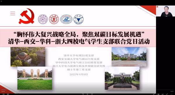 4月9日晚,清华、浙大、华科、西交电气学科四校学生党支部全体学生党员和部分团员齐聚“线上”,举办学生支部联合党日活动。清华大学电机系党委副书记郑泽东、华中科技大学足球比分直播 党委副书记罗珺、西安交通大学电气工程学院党委副书记宋杰、浙江大学电气工程学院党委副书记徐超炯参加活动。