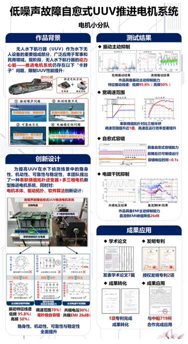该作品是面向无人水下航行器所设计的一种新型推进电机系统,通过对电机本体、变频器拓扑、调制算法三个部分进行匹配设计与联合优化,有效降低了电机系统的振动噪声及电磁噪声水平,提高了系统的容错运行能力。该作品对于提高水下航行器的隐身性、机动性、可靠性以及稳定性等综合性能有着重要意义。