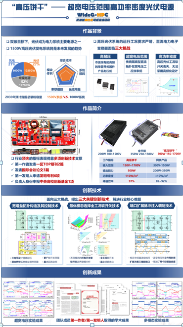 团队提出一种用于光伏发电系统的超宽电压范围的高功率密度DC/DC变换器——“高压饼干”。“高压饼干”电源能在高电压等级、超宽电压范围实现高效工作。作品依托于团队提出的混合型三电平双有源桥拓扑,其能够实现150-1700V的输入电压和48V的输出电压的隔离直流-直流高效变换。针对典型混合型三电平双有源桥拓扑系列,团队提出三种创新技术:增益扩展控制技术,实现了超宽增益下全范围的软开关和最小回流功率;多模态调制技术,以软开关为前提的最小损耗作为最优模态边界选择原则,提高了小负载工况的工作效率;脉冲注入调制技术,使拓扑可以进行多端口扩展。