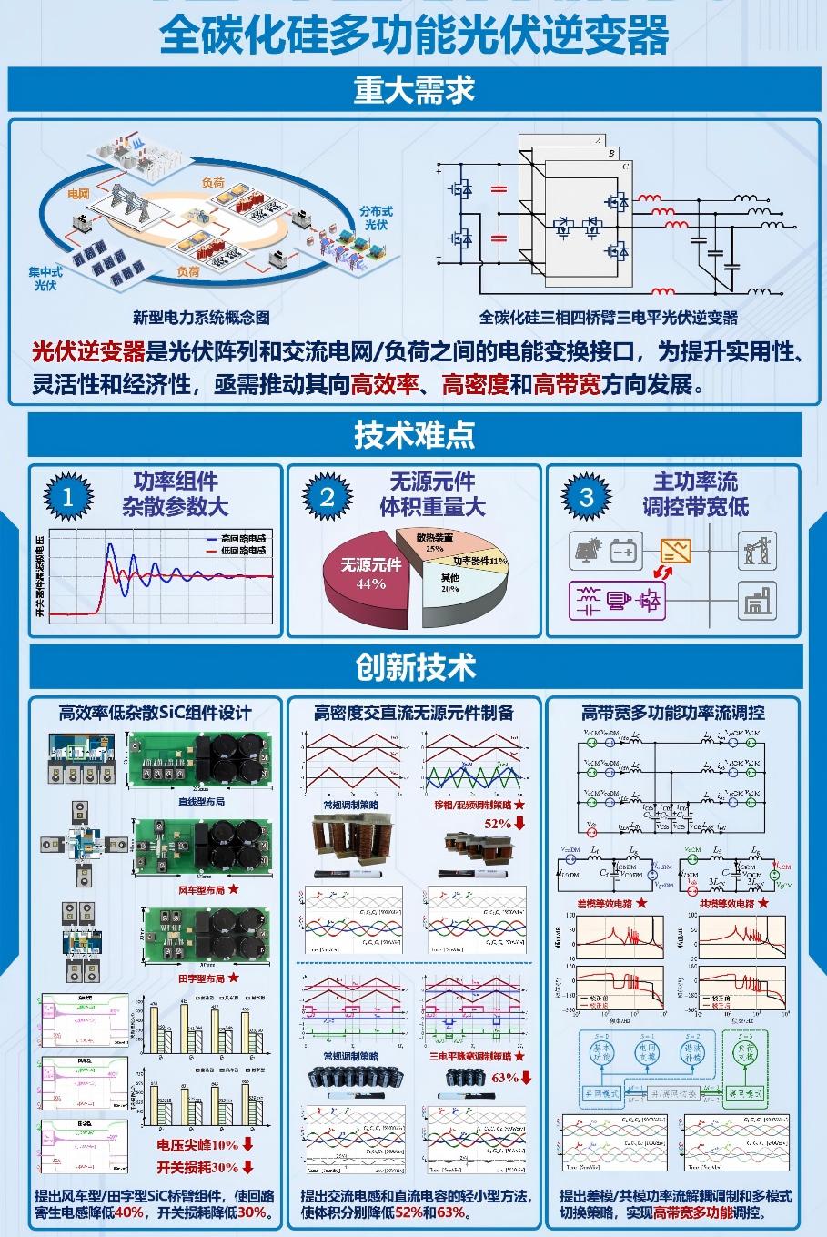 光伏逆变器是光伏阵列与交流电网/负荷之间的电能变换接口,对构建高质效光伏发电系统至关重要。目前,商用光伏逆变器主要采用Si IGBT作为主功率器件,存在开关速度慢、开关损耗大等问题,导致开关频率低,严重制约了光伏逆变器的功率密度和调控带宽。本作品采用SiC MOSFET代替Si IGBT,通过充分发挥SiC MOSFET的高速和高频优势,完成全碳化硅多功能光伏逆变器样机研制,实现峰值变换效率99%、体积功率密度1.5kW/L等技术指标。