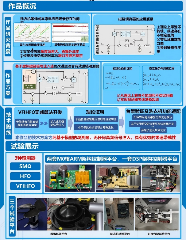 在家电领域内,传统的基于模型法的永磁同步电机无位置传感器算法存在零速不能观和低速不稳定两大问题,应用到实际产品时能效低、噪音大、控制算法复杂等。本作品采用基于虚拟磁链信号注入的混合磁链观测器算法,加入观测器系数自适应机制,实现了包含零速的全速域稳定运行以及精确的位置闭环控制。与市面在售的10kg一级能效洗衣机的对比测试中,本作品算法在实现一级能效的同时,可实现12kg衣物的机洗效果。