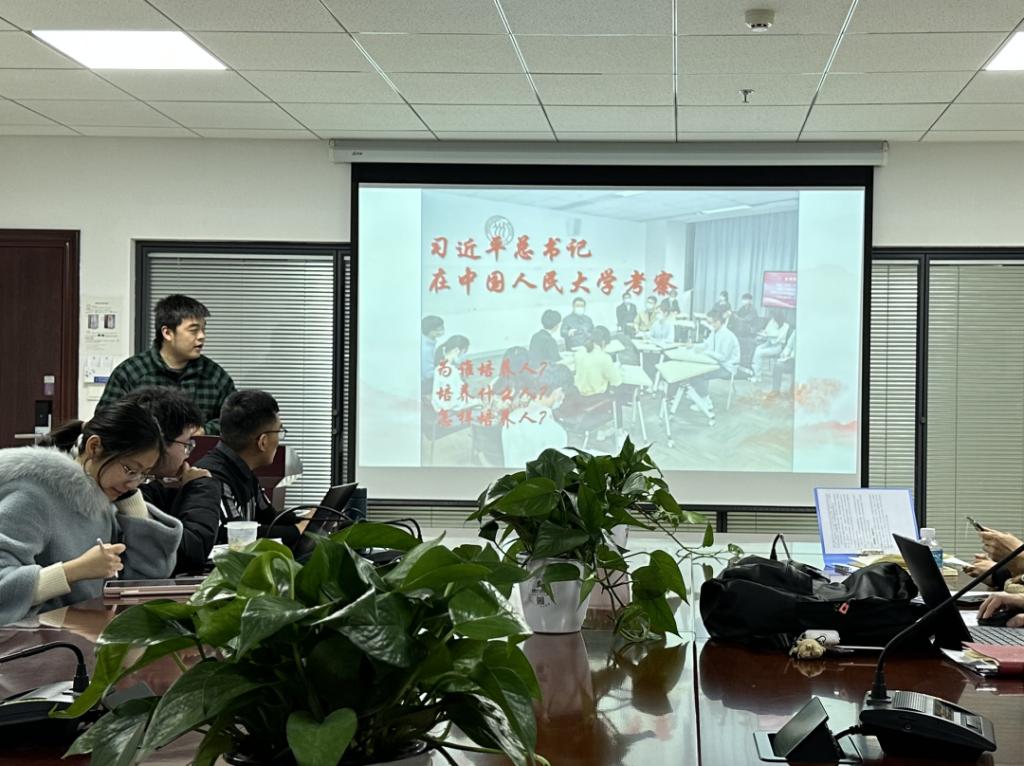 硕2202班党支部书记夏子龙介绍党支部以深入学习党的二十大精神为主线,组织开展了一系列党建相关活动,顺利完成了从建立到发展、从生疏到磨合、从不会学到带头学的全过程。党支部坚持政治引领、夯实理论基础,按时按量组织三会一课工作,定期召开党员大会、支委会、党小组会;党支部把稳意识形态,理论武装思想,支部成员紧密联系工作实际,扎实开展批评与自我批评,深入剖析思想上、作风上存在的突出问题。