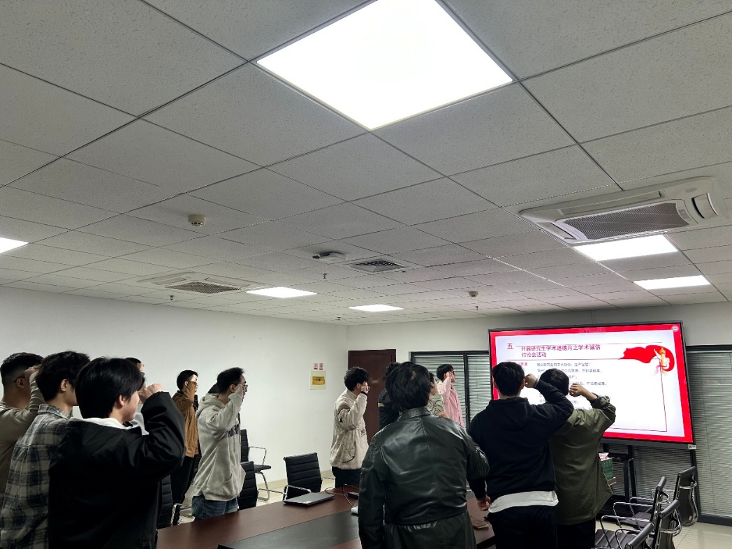 在研究生学术道德月之学术诚信讨论会环节,李达志带领支部成员共同学习了学术诚信相关法律法规。在李达志同志的带领下,全体研究生党员庄严宣誓:恪守学术底线,不伪造数据、不抄袭成果;尊重知识产权,规范引用署名;以责任意识筑牢科研根基......铮铮誓言彰显了青年科研人坚守学术诚信、守护科研尊严的决心。