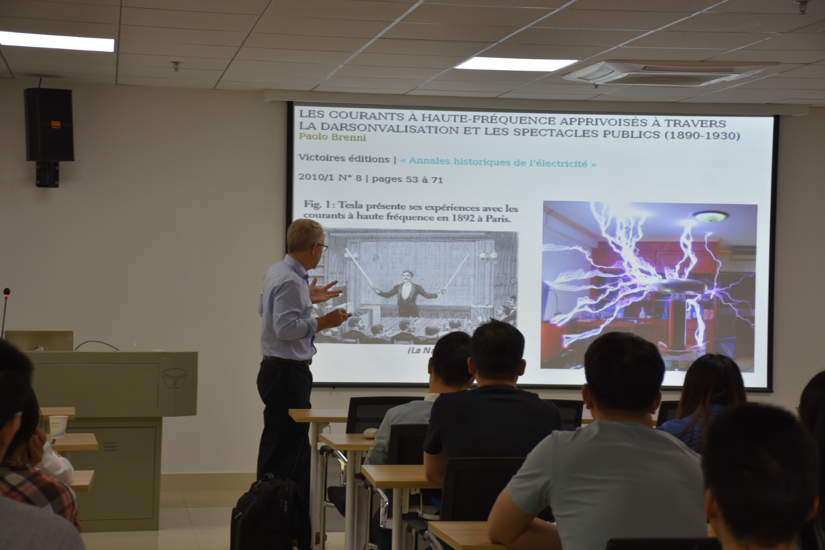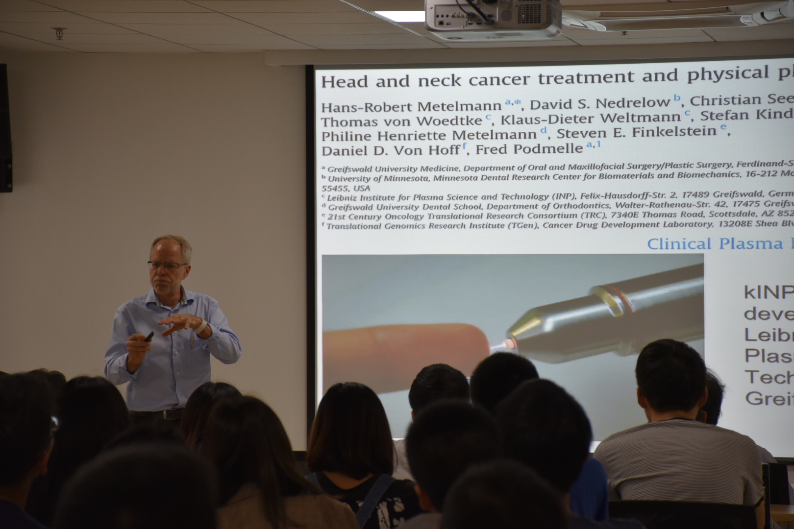 5月21日上午,David Graves教授作了主题为“Plasma Medicine Mechanisms”(等离子体生物医学机制)的讲座。Graves教授首先生动的讲述了等离子体生物医学的历史,在展示了等离子体对一些疾病的作用效果后,为我们详细介绍了等离子体在生物医学领域的作用机制,并指出了等离子体产生的活性粒子在对伤口感染、肿瘤检测方面的响应机制。
