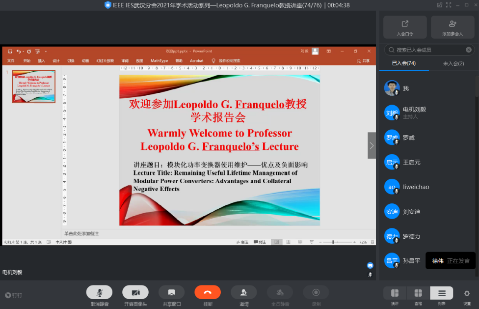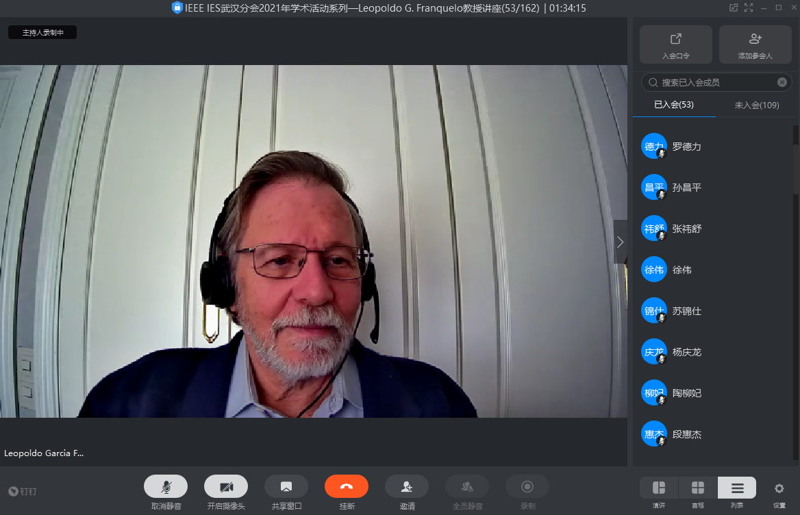 受IEEE工业电子学会(IES)武汉分会和足球比分直播-体育网足球即时比分的邀请,IEEE Life Fellow、IEEE IES学会 卸任主席、IEEE TIE卸任主编、IEEE OJIES创始主编Leopoldo G. Franquelo教授于3月25日做客“携手电气精英,与未来同行”系列讲座第412期暨IEEE IES武汉分会2021年学术活动系IEEE IES 杰出讲师讲座(Distinguish Lecture),通过钉钉会议平台在线作了一场精彩的学术报告“模块化功率变换器使用维护——优点及负面影响”。