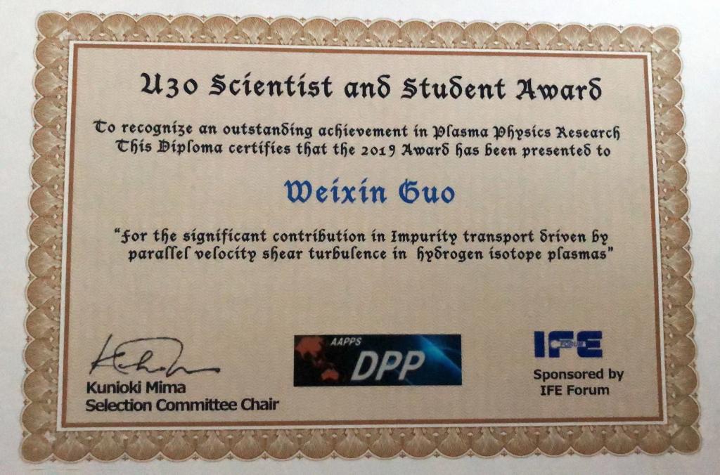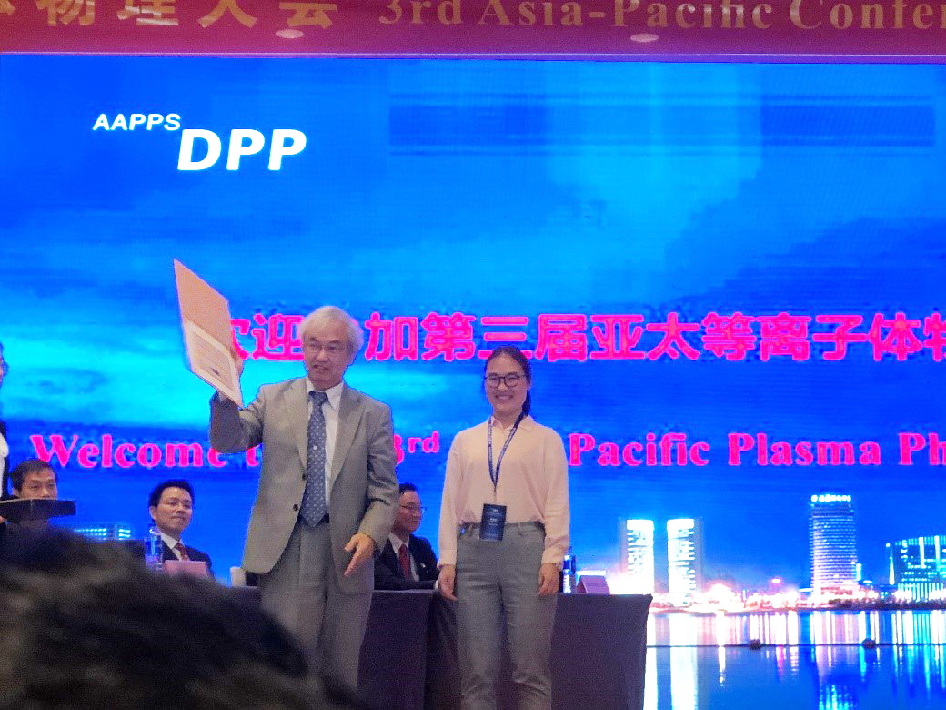 2019年11月4日至8日,第3届亚太物理联合学会等离子体物理大会(3rd AAPPS-DPP)在合肥召开。华中科技大学聚变所博士后郭伟欣荣获“30岁以下年轻科学家与学生奖”(U30奖),以嘉奖其在氢同位素等离子体中研究平行速度剪切湍流驱动杂质输运的理论成果。开幕式上举行了颁奖仪式,U30奖评委主席 Kunioki Mima教授为郭伟欣颁奖。