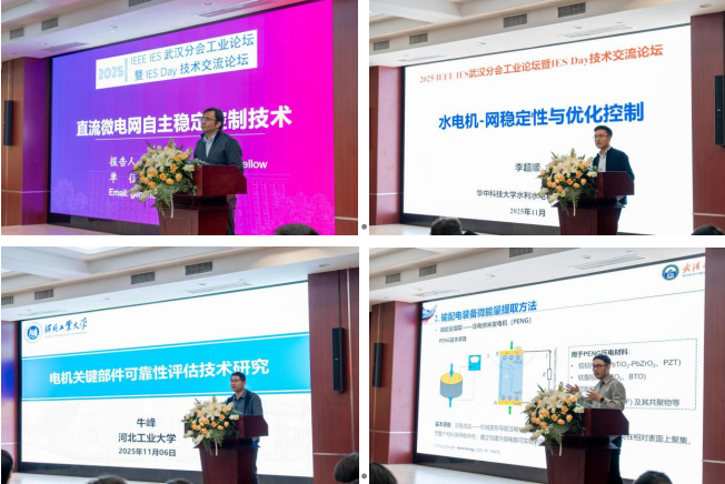 耿华、李超顺、牛峰和肖淞分别做专题报告,从直流微电网自主稳定控制技术、水电机-网稳定性与优化控制、电机关键部件可靠性评估技术研究、面向输配电装备状态智能感知的自取能传感方法与器件等方向介绍了目前最新技术及工业应用发展趋势。与会者进行了积极与热烈的讨论。