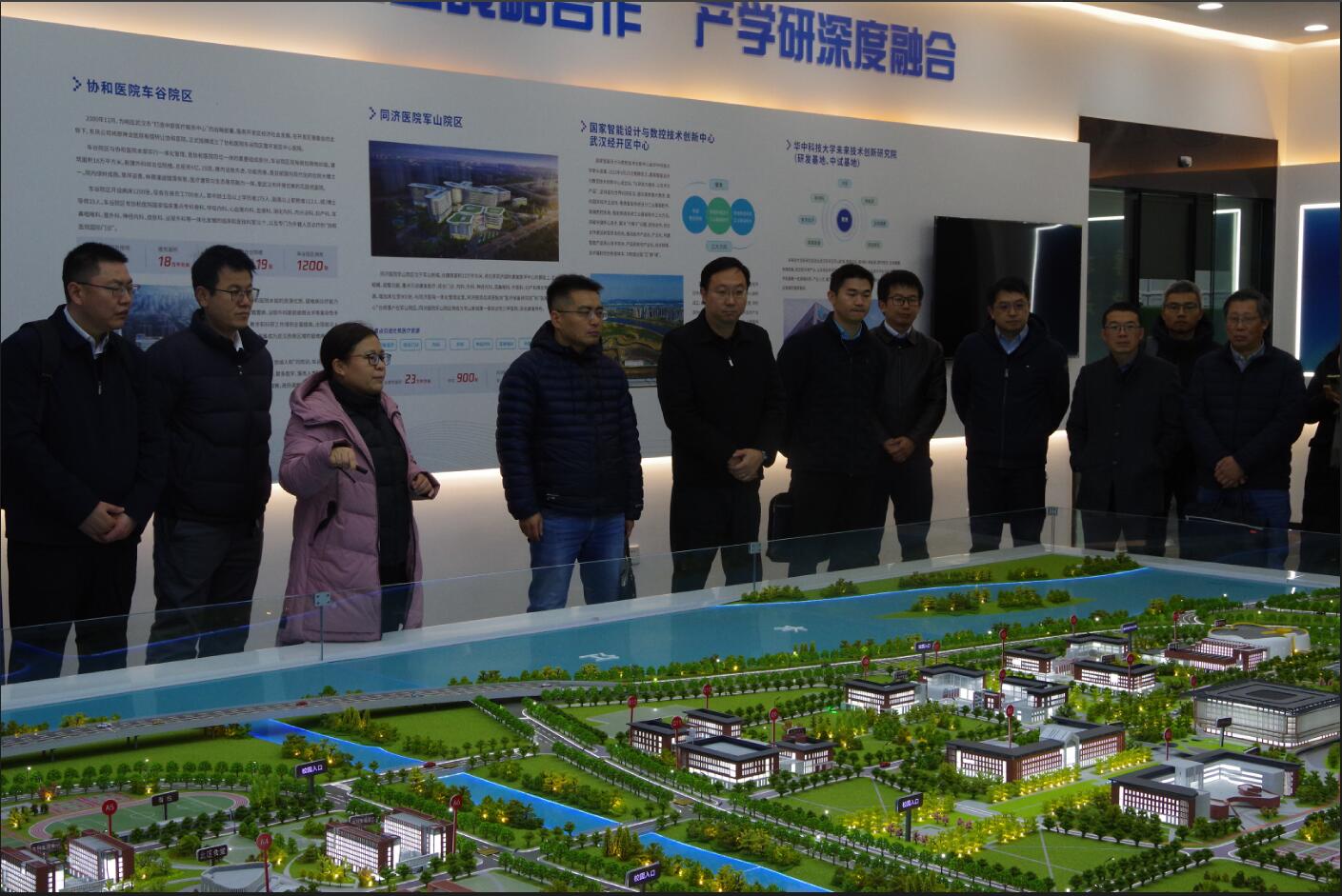 参观结束后,中心组一行乘车前往华中科技大学国际教育科技创新园区(军山校区)参观。园区建设办公室主任陈扬、工程技术科科长李小琳带领中心组一行参观了正在建设的碳中和与环境保护学部大楼,介绍了大楼的建筑进度和使用规划。此后,中心组一行前往军山校区接待厅进一步学习了解,建设办公室副主任魏晓云在沙盘前介绍了园区的整体规划、功能分区、学部设置、建设进度、周边环境。