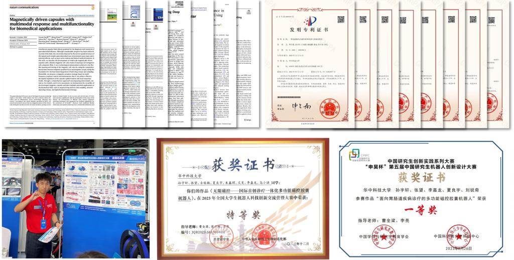 医工攻坚,守护生命健康。面对我国高端医疗装备长期受制于人的困境,孙宇轩组建跨学科攻关团队“无限磁控”,深入武汉协和医院等临床一线调研,将磁控软体机器人技术与临床需求深度融合。针对现有胶囊机器人“只能诊、不能疗”的难题,孙宇轩及其所在团队首次将将磁控软体机器人技术引入胶囊设计中,打破了传统内置刚性永磁体设计模式,形成国际首创的磁控软体胶囊机器人技术路线,为实现胶囊机器人诊疗一体化提供了全新方案。所开发机器人较国际水平体积减小25%,有效载荷提升5倍。凭借这一创新成果,孙宇轩带领团队先后斩获2024年中国国际大学生创新大赛金奖、2023年全国大学生机器人科技创新交流营特等奖、第五届中国研究生机器人创新设计大赛全国一等奖等双创赛事最高荣誉。