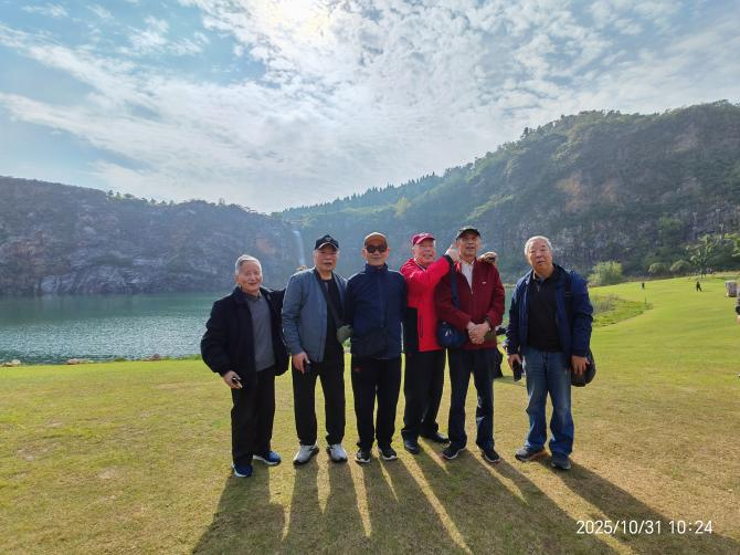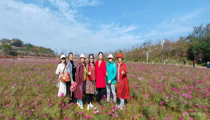 退休教师们从学校集结出发,车行一路,笑语一车,温馨的笑谈中车外的景象由栉比鳞次的高楼大厦渐渐换成了田野的秋色,山谷的叠翠,上午十时进入了以矿业文化、农田景观为特色,发展多元生态产业,将废弃矿区打造成的灵山花境公园。“灵山花境”已被誉为武汉“稻城亚丁”,漫山遍野的花海与澄澈静谧的矿湖构成了一幅绝美的秋日画卷,老师们三五成群,沿着景区步道缓缓前行,呼吸着清新的山林空气,欣赏着由昔日矿山改造而成的生态美景,依次邂逅灵花水瀑、翡翠湖、矿野石林,一路尽览生态修复后的独特景致。山乡巨变,百闻不如一见,在花海中穿行老师们深切感受到了习近平总书记“绿水青山就是金山银山”的深远意义,在花海的深处,高山之巅50米高的瀑布近在眼前,壮丽的景观深深震撼着大家。景区内,七彩花田、高山草甸、复古步道、灵山古寺、矿坑湖泊等景观错落分布,构成了废弃矿山变身的生态画卷。在灵山花境打卡点处,瀑布从峭壁垂落,水流如银练,溅起的水花在阳光下闪着微光,与花海、山林相映成趣。老同志们或漫步花间,或驻足以瀑布为背景拍照,沉浸在如画山野中,“老有所乐”体现到了极致。