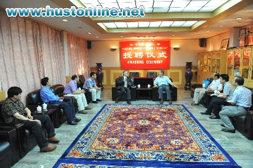 副校长罗俊,国际交流处、国家脉冲强磁场科学中心(筹)相关负责人出席了授聘仪式。国际交流处常务副处长余海林主持仪式,国家“”入选者、脉冲强磁场科学中心叶培德教授介绍了Klaus von Klitzing教授的简历,罗俊向Klaus von Klitzing颁发了聘书并赠送学校礼品,并决定在我校设立以Klaus von Klitzing命名的系列高水平科研讲座。