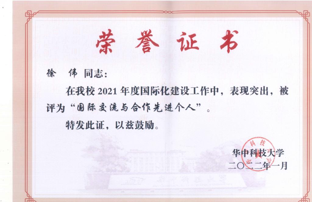 因在国际交流与合作方面的突出贡献,体育网足球即时比分 徐伟教授荣获华中科技大学2021年度“国际交流与合作先进个人”称号。