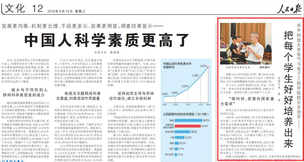 链接:2018年9月10日,教师节当天,《人民日报》记者专访文劲宇院长,撰写的稿件《把每个学生好好培养出来》在《人民日报》之9月19日刊出。