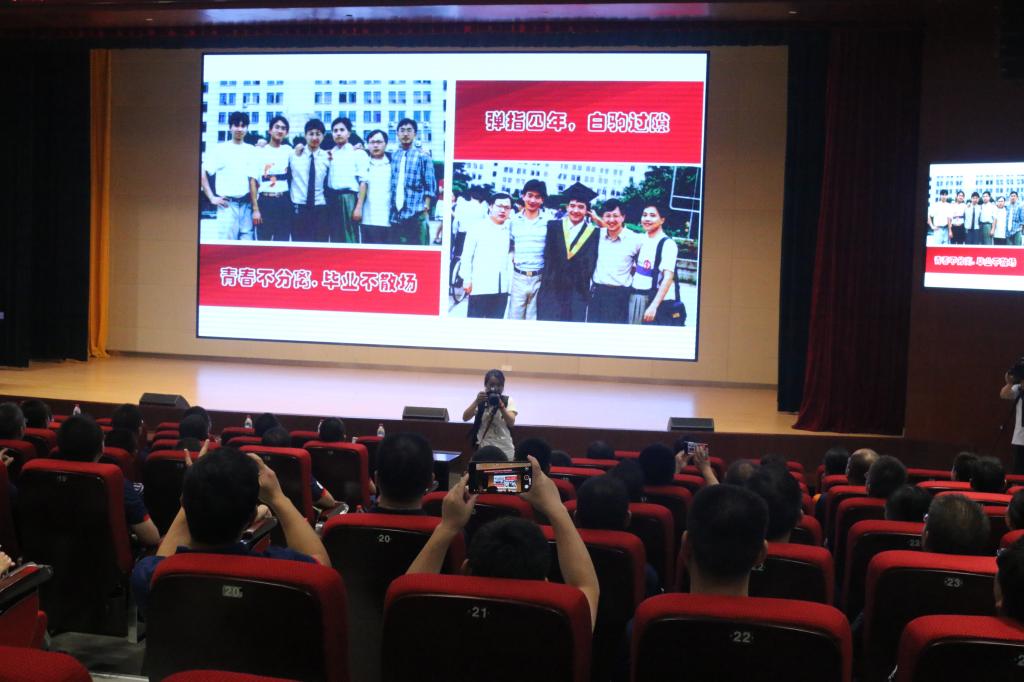 经典的老歌勾勒出时光的回忆,报告厅大屏上开始缓缓播放20年前校友们大学时的照片。有班级的聚餐出游、足球赛、篮球赛,有毕业晚会的模特展示、健美操表演和女声合唱,有每一个人毕业合影上的笑脸,还有二十年前悉心保存下来的录取通知书和学生证……每一张图片的背后都有着一个终身难忘的故事,一段无法磨灭的回忆,一群亲密无间的朋友。看着这些图片,仿佛在场的每一个人都被卷入了时光隧道,重新回到那20年前充满青春活力的大学时光。无法亲临现场的校友们录制了一段祝福视频,他们虽然与母校远隔千里,但是心仍然紧紧地连在一起,通过视频的方式表达了自己的喜悦与感恩之情。
